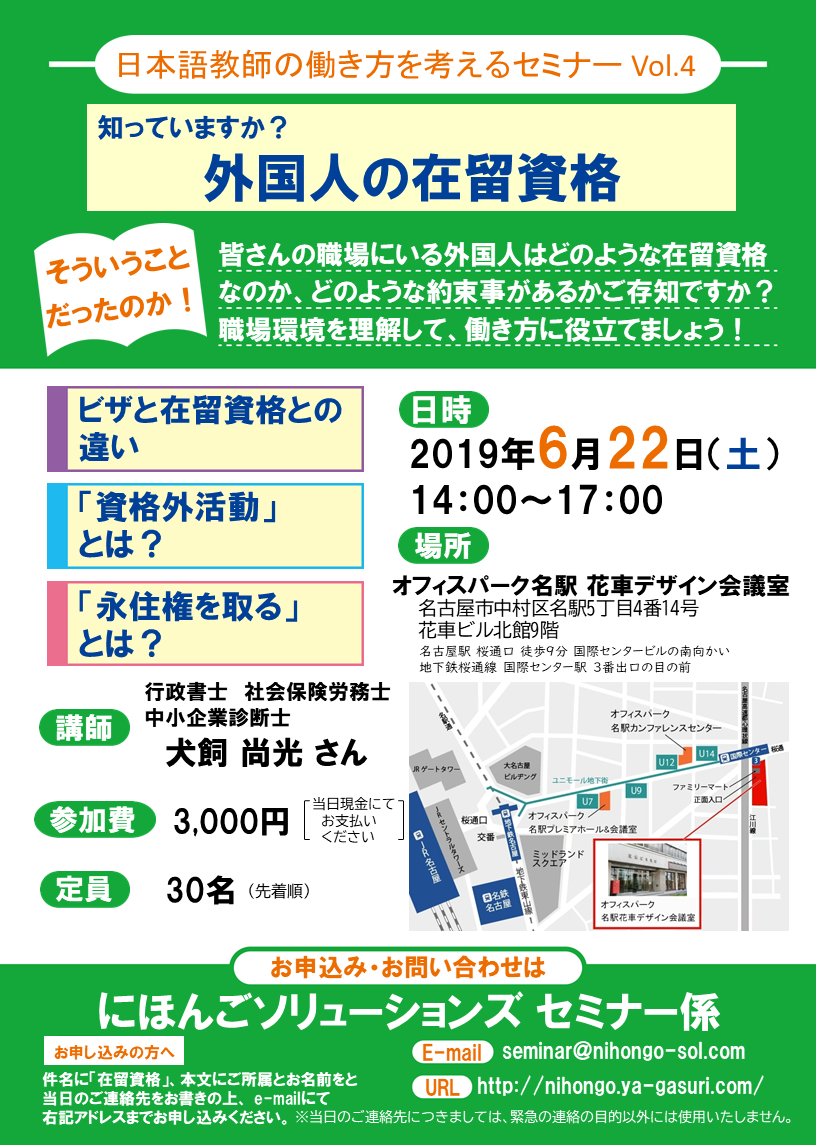 日本に滞在する外国人の在留資格を知ることは、日本語教師の働き方に関わるようには見えないのですが、実は深いところではつながっているのです。「ここは知っておいたほうがいいですよ」という部分に焦点を当ててお話をしてまいります。そして日本語教育機関で働く人・学ぶ人の相互理解に役立つものになればと思います。
